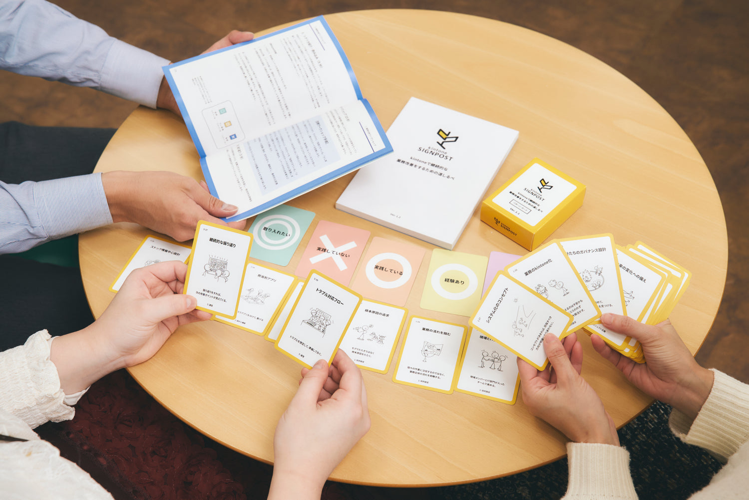 「作成した kintone アプリを社内のみんなに便利に使ってほしい!」と考えている方は、『アプリ構成を考えよう!貼ってはがせる kintone フィールドステッカー』がオススメです。社内での kintone の共通言語をつくりたい方は、『kintone SIGNPOST パターン冊子』と『kintone SIGNPOST パターンカード』を併せて使い、チームでのワークショップを実施するのがオススメです。
