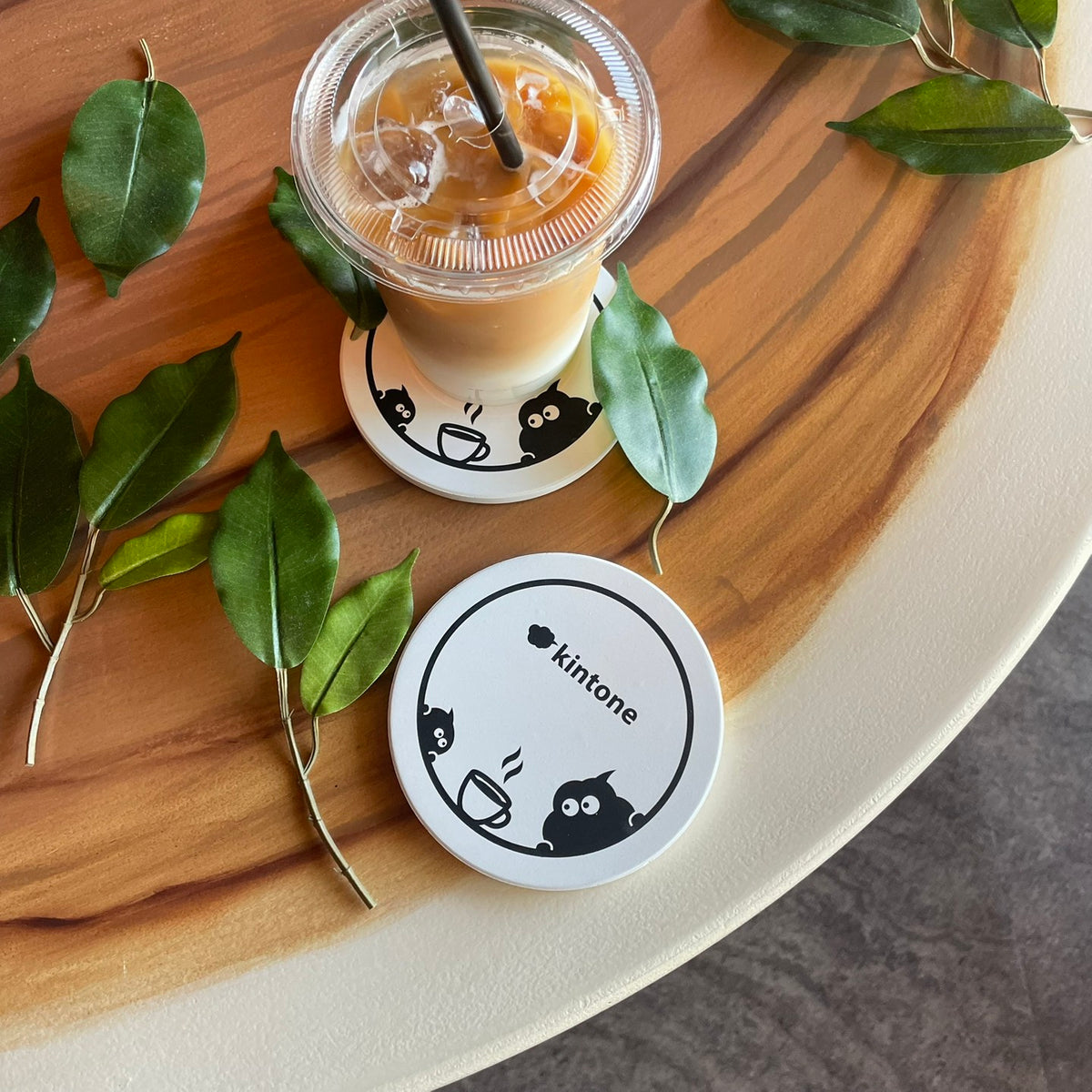 kintoneのロゴマークの雲をイメージした公式キャラクター「キントン」のコースターが、